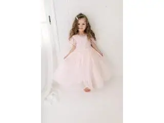 This blush pink rustic lace flower girl dress is a timeless, vintage-inspired piece made for unforgettable moments. Featuring a delicate crochet lace bodice with cap sleeves and a flowing ankle-length tulle skirt, it blends romantic boho charm with elegance. Perfect for weddings, portraits, birthdays, and other special celebrations.